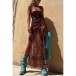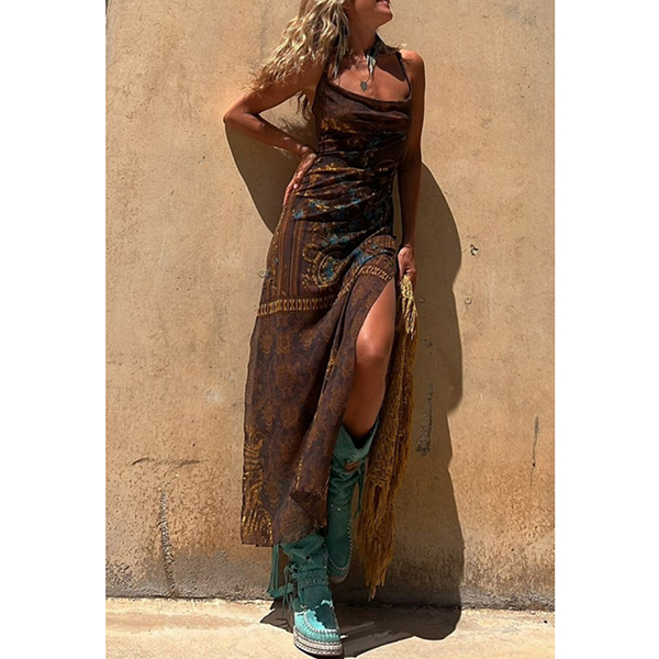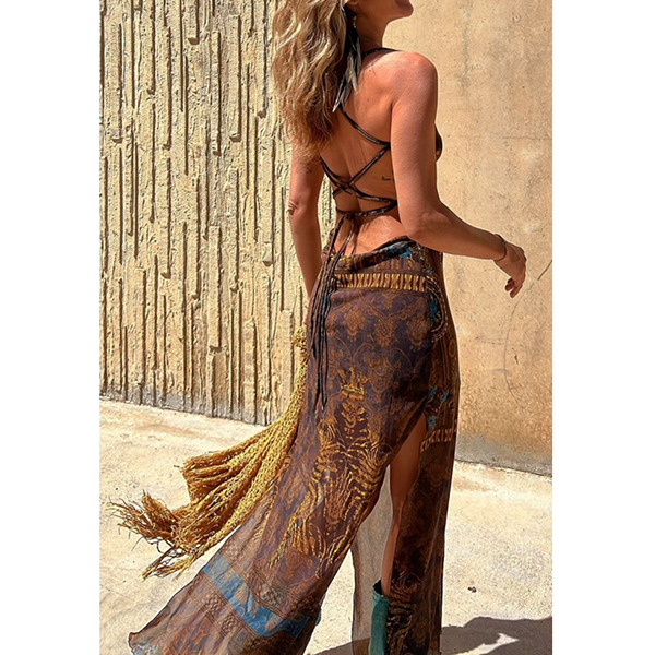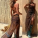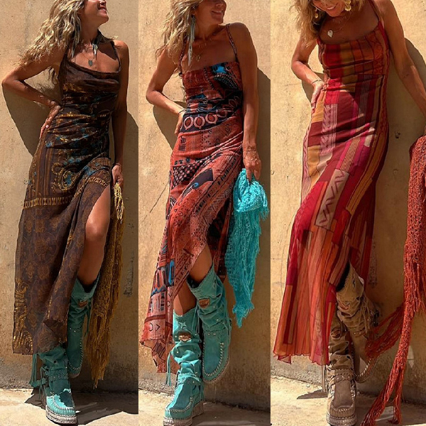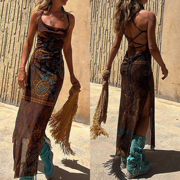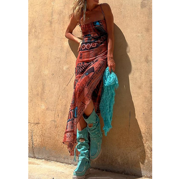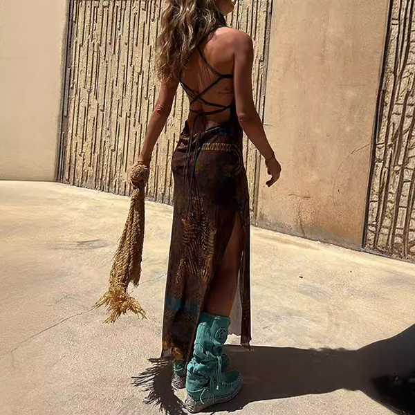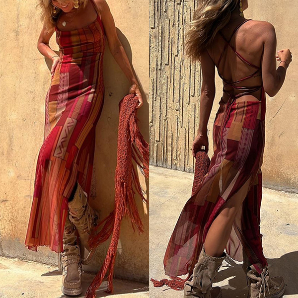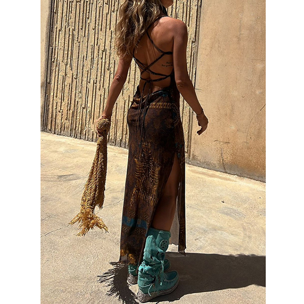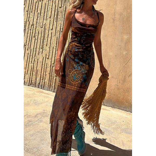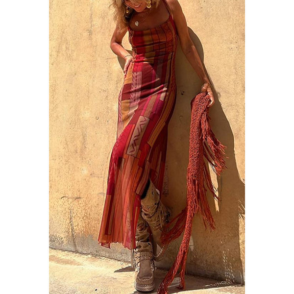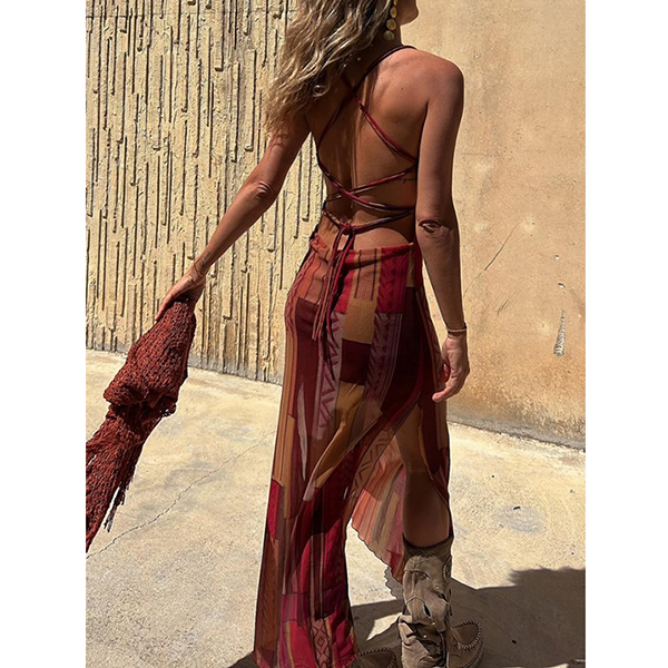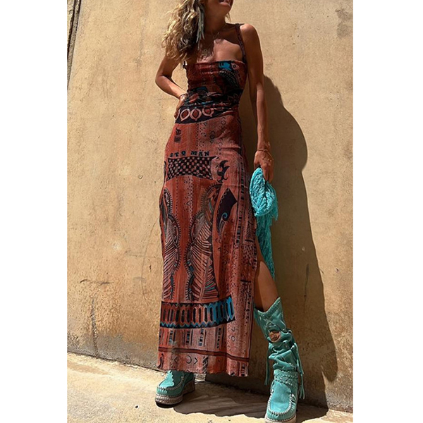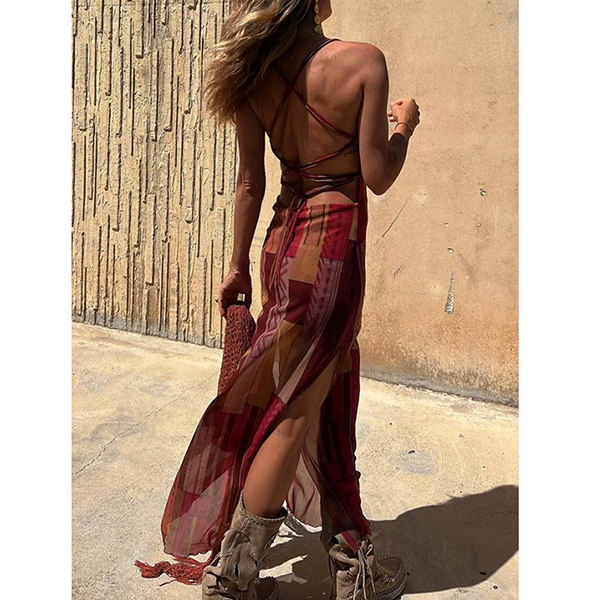 Sleeveless Printed Elastic Suspender Mesh Dress with Slit Detail