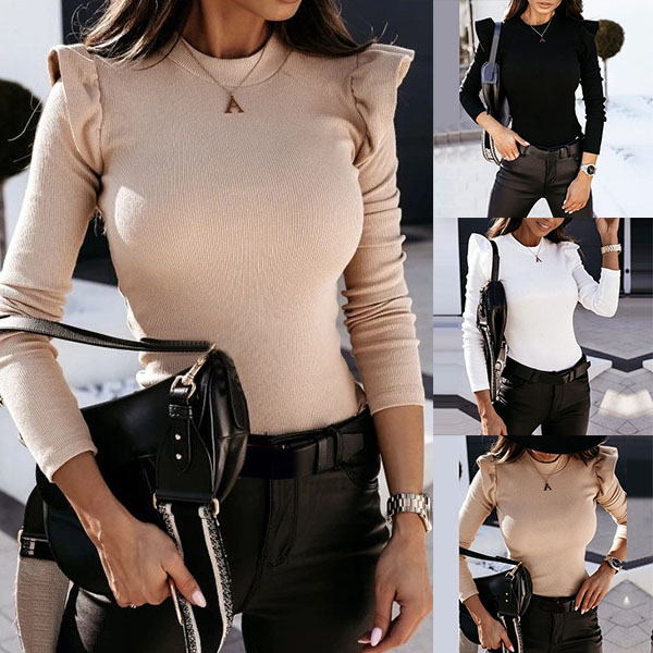 Solid Color Round Neck Long Sleeve Slim Fit Knitted Top
