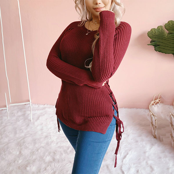 Solid Color Round Neck Side Lace-up Long Sleeve Knitted Top