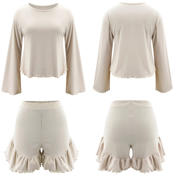 Solid Color Round Neck Trumpet Sleeve Top+Shorts Two-piece Set