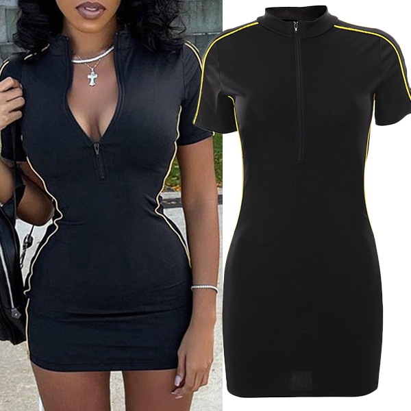 Shirt dress featuring contrast color stripe print, mock neck, front zipper V-neck. Pair it with your favorite sneakers or flats for a complete look.