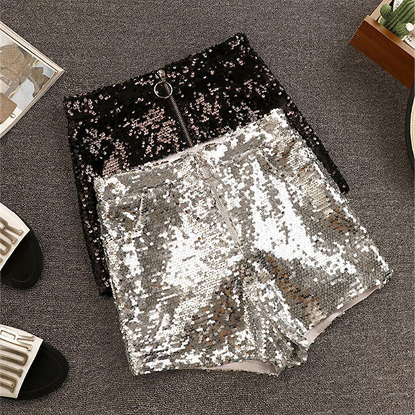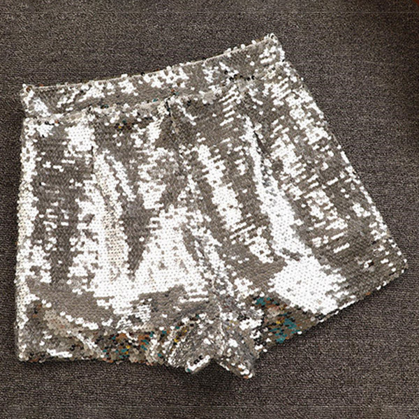 Straight Silver Sequin Shorts with Elastic Waistband and Tassel Drawstring