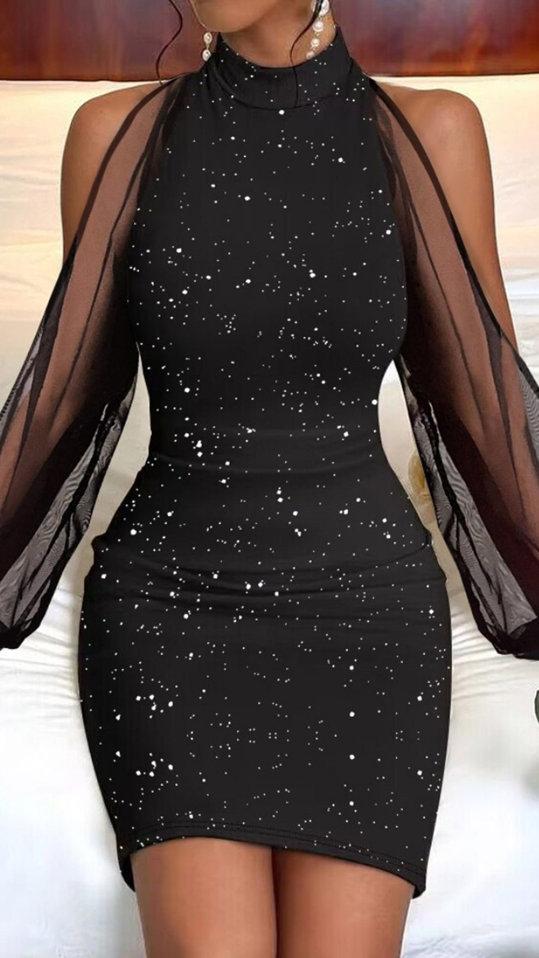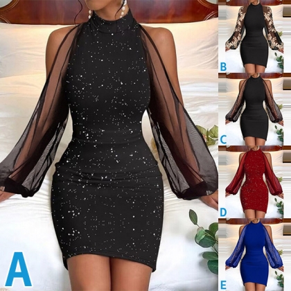 Featuring a mock neck and long sleeves, this bling-bling dress exudes a sense of elegance and sophistication. The gauze spliced long sleeve with slit design adds a stunning and eye-catching element, making it a standout piece in your wardrobe. Crafted from high-quality fabric, this bodycon dress offers a comfortable and flattering fit.