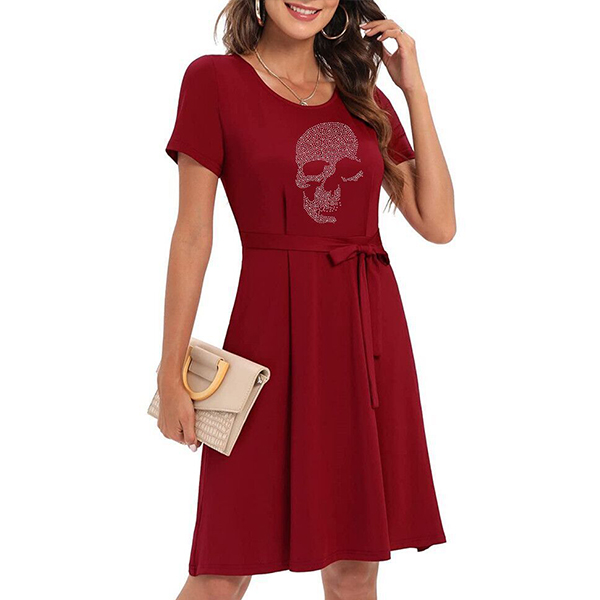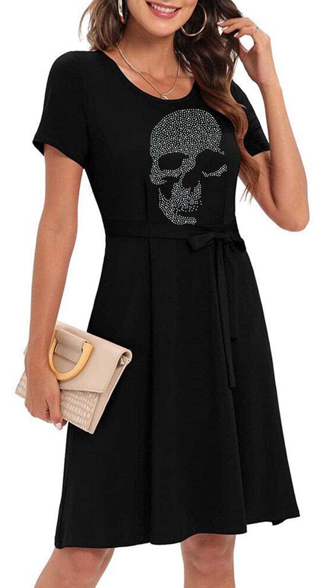 This dress features a round neckline and short sleeves, providing a classic and flattering silhouette. The skull print design adds an edgy and rebellious touch to the overall design, while the bling-bling detailing adds a touch of glam and sparkle. The self-tie waist provides a comfortable and flattering fit, accentuating your curves and creating a flattering silhouette. Wanna have a try?