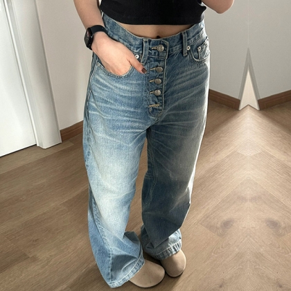Street Fashion Button High-rise Old-washed Straight-cut Denim Pants