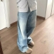 These street-style denim pants feature a high-rise waist, button closure, straight-cut silhouette, and old-washed finish, creating a classic and versatile look.