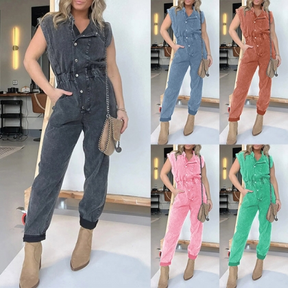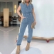 Street Fashion Button V-neck Short Sleeve Loose Old-washed Denim Jumpsuit for Women