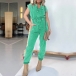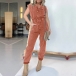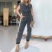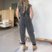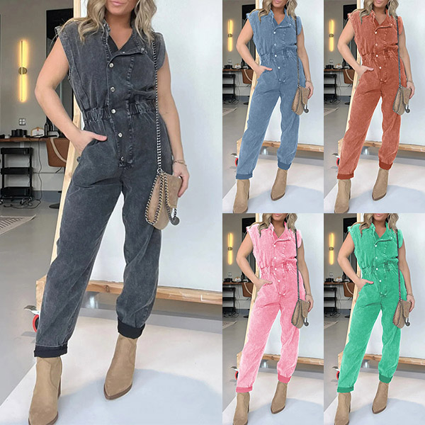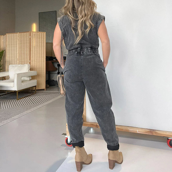 This is trendy and versatile demim jumpsuit that combines a button V-neckline, short sleeves, loose fit, and old-washed denim fabric for a stylish and edgy street fashion look. For a laid-back look, you could pair it with sneakers or sandals.