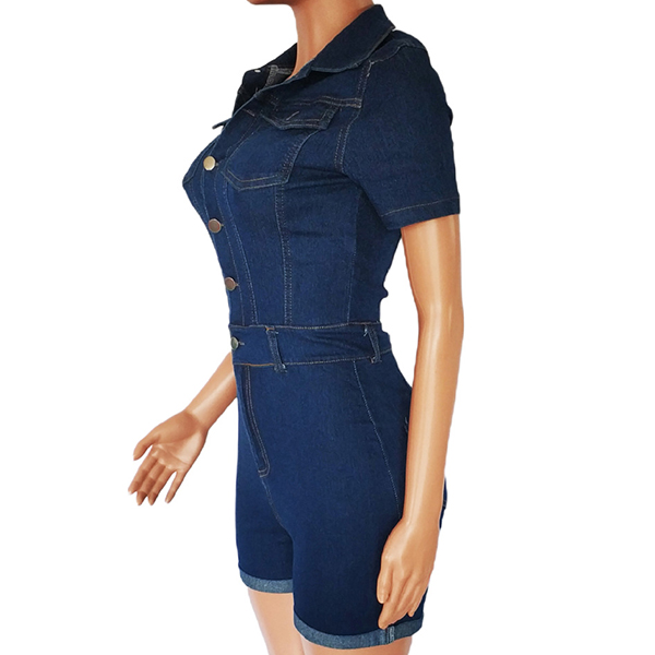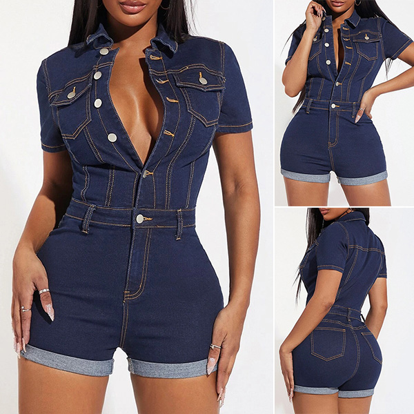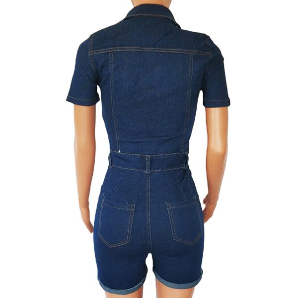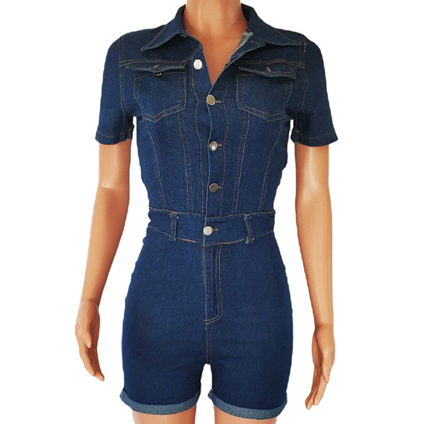 This romper combines comfort and style, making it a must-have for your summer wardrobe. The stand collar adds a touch of sophistication, while the short sleeves keep you cool and comfortable in warm weather. Made from high-quality denim fabric, this romper has a trendy and casual look that is perfect for a day out or a casual hangout with friends.