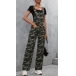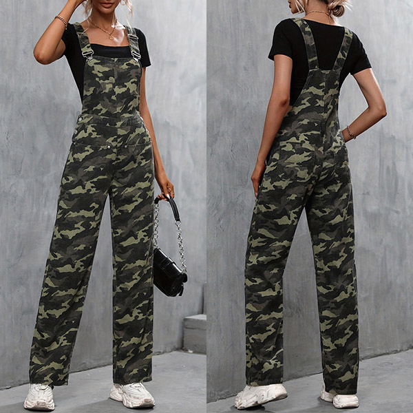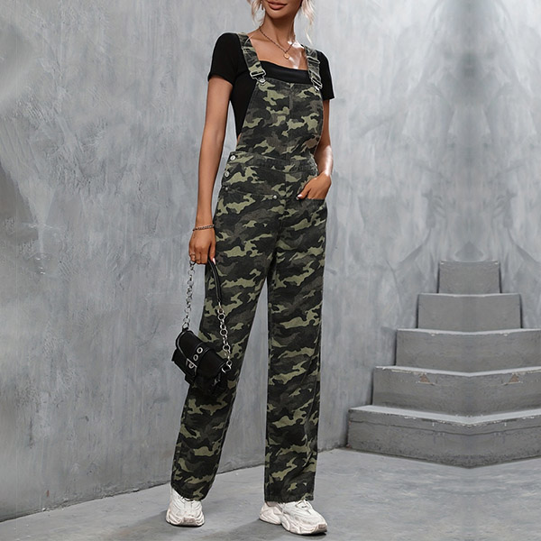 This jumpsuit features a camouflage print, a straight-cut silhouette, denim fabric, and suspender straps for a trendy and statement-making look. Pair it with sneakers and a beanie for a casual and urban look.