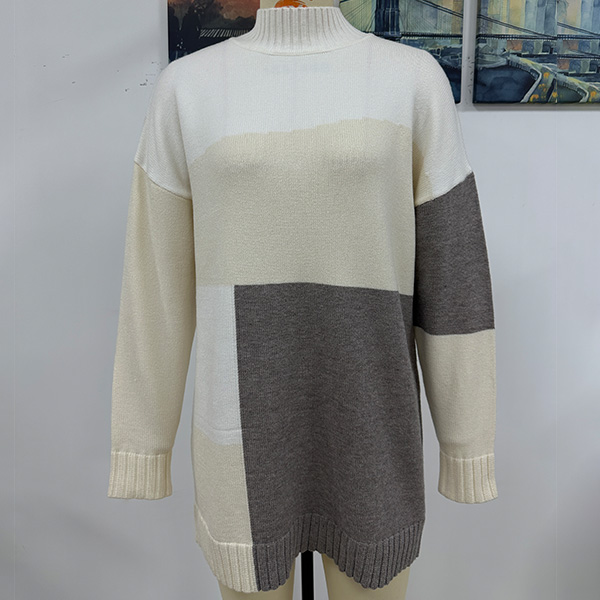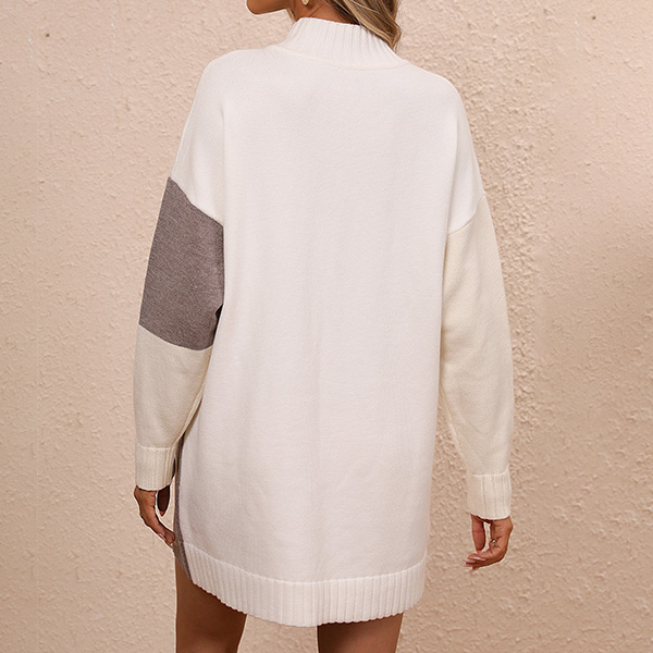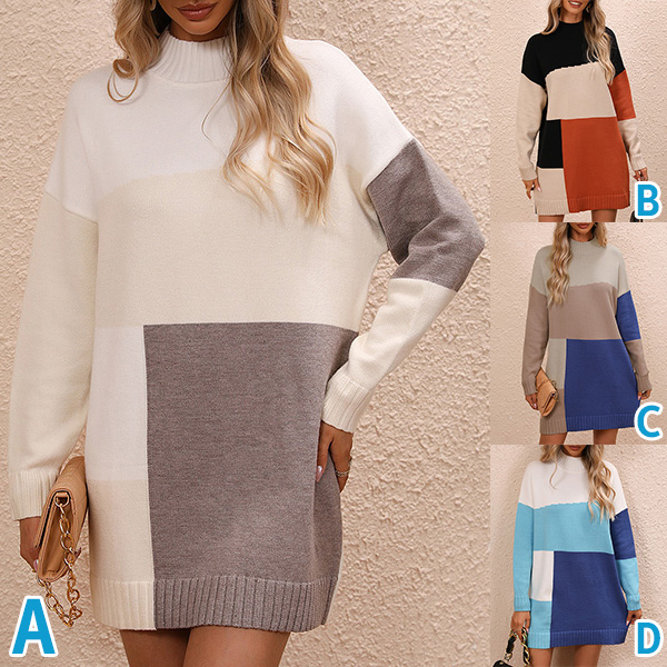 This dress combines the comfort of a sweater with the style of a dress, making it a versatile and trendy addition to your wardrobe. The contrast color block design adds a modern and eye-catching element to the dress, creating a unique and fashionable look.