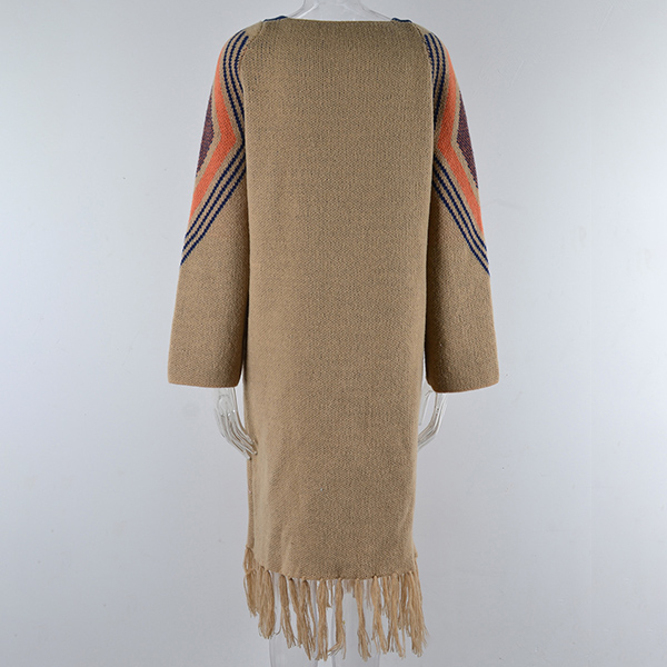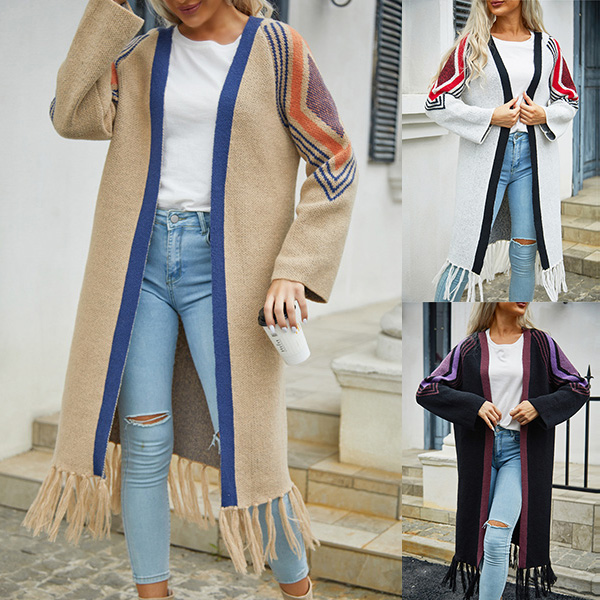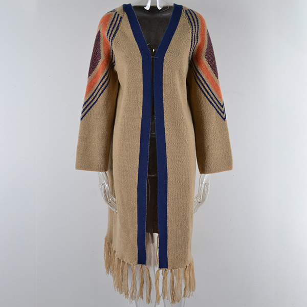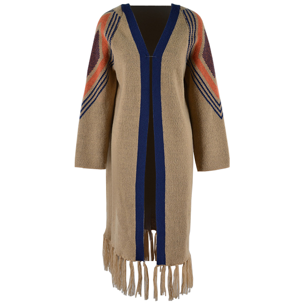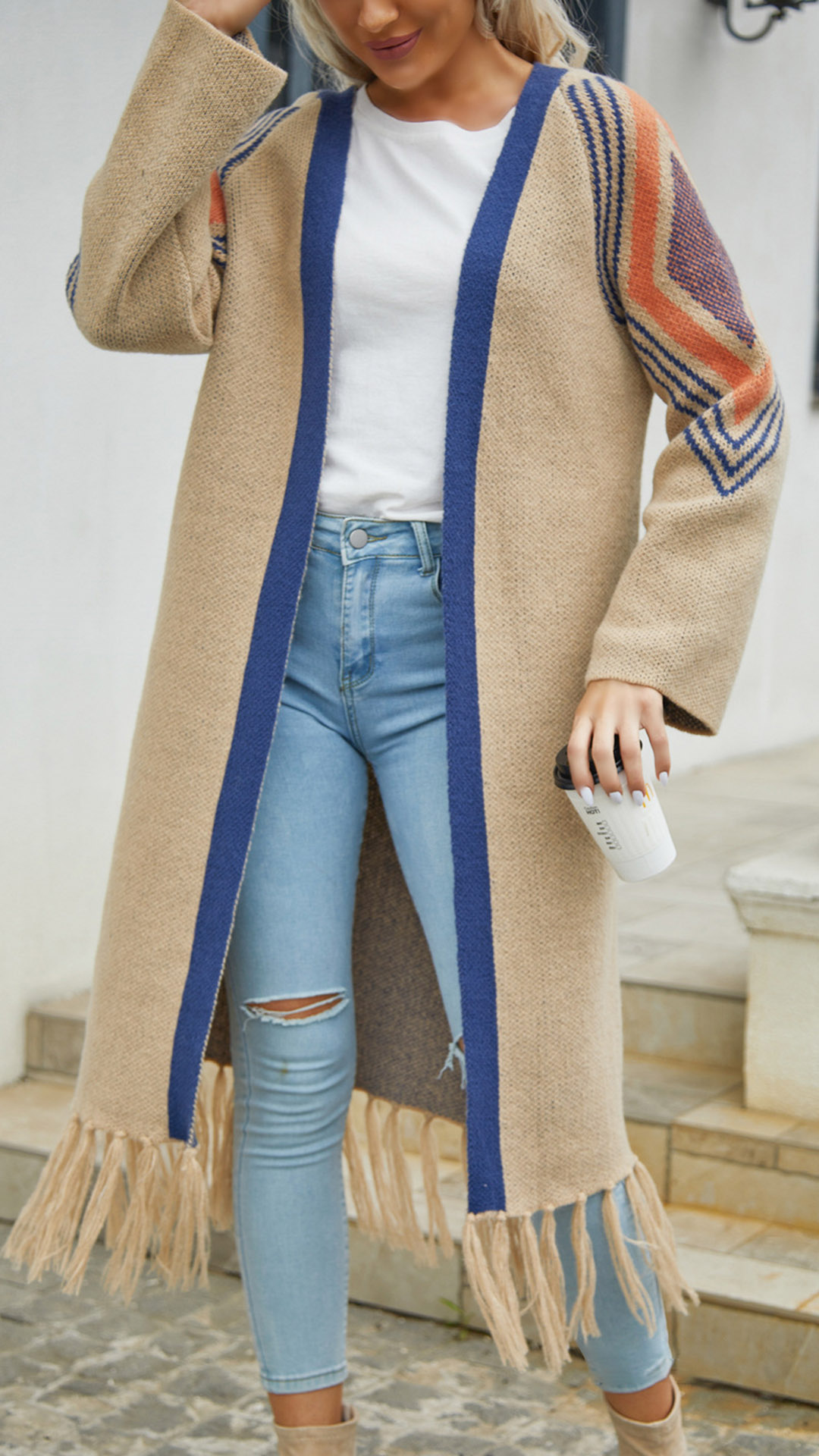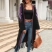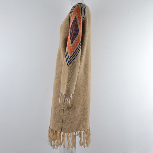 Street Fashion Contrast Color Diamond Pattern Long Sleeve Tassel Longline Cardigan