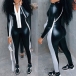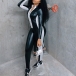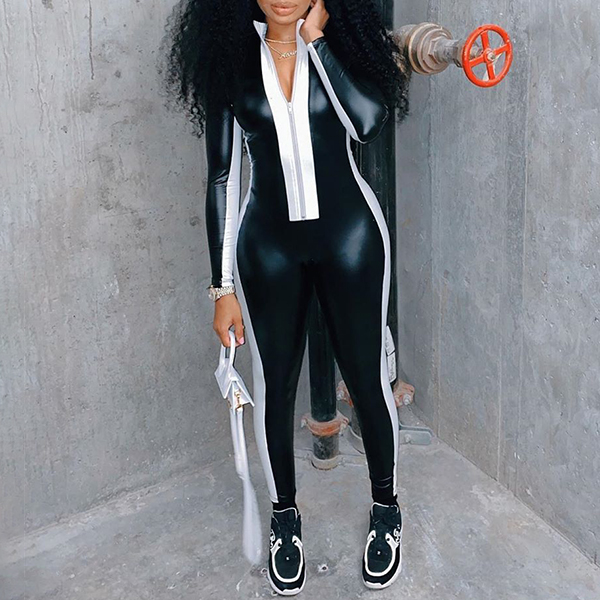 Street Fashion Contrast Color Half-zip Long Sleeve Slim Fit Artificial Leather PU Jumpsuit