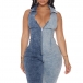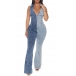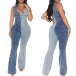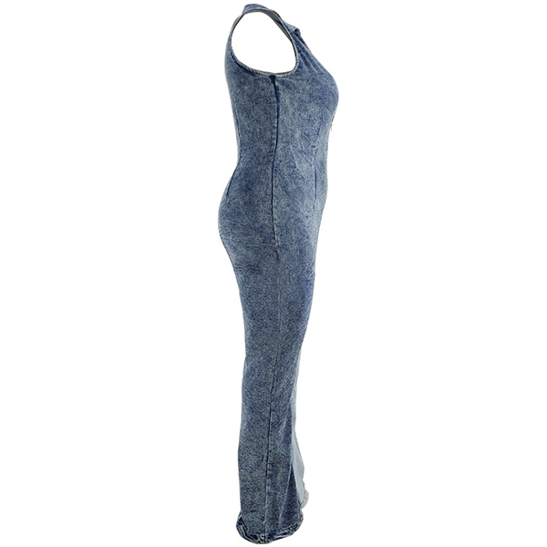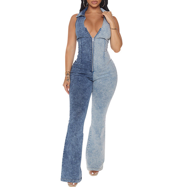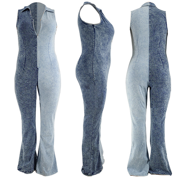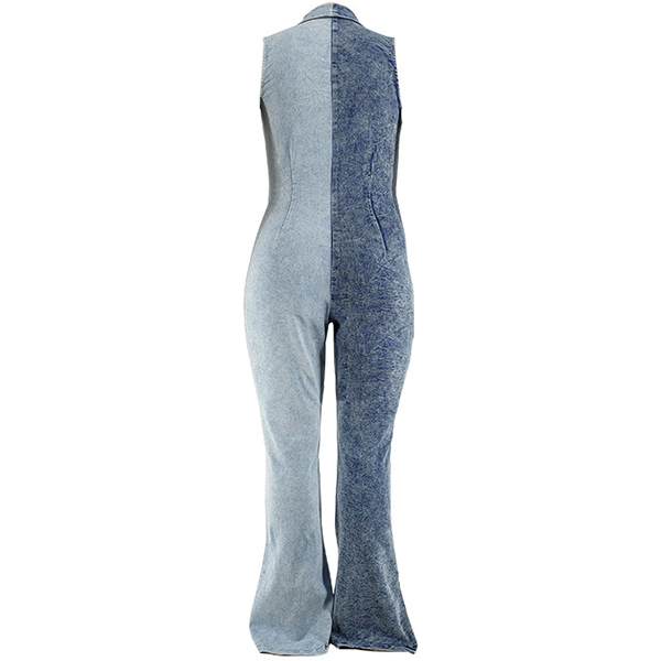 Street Fashion Contrast Color Half-zipper Stand Collar Sleeveless Wide-leg Denim Jumpsuit