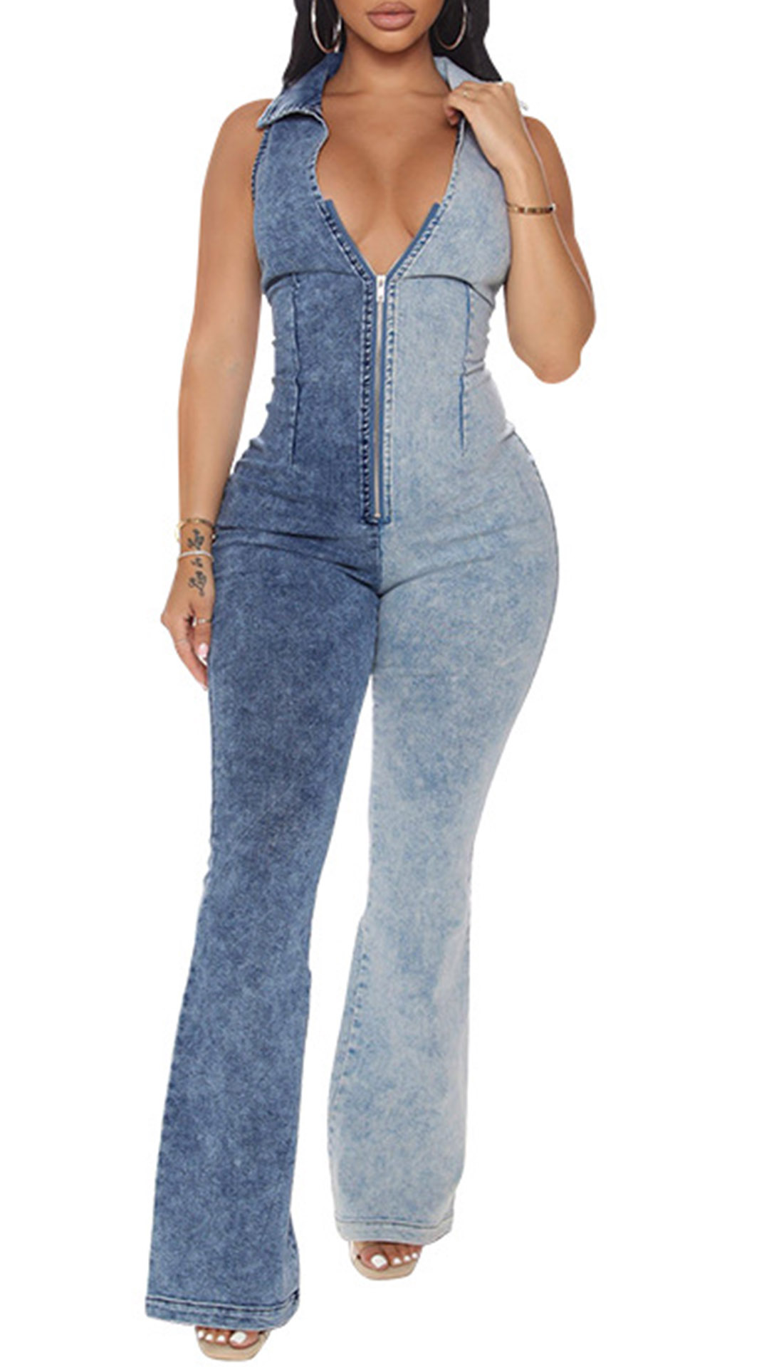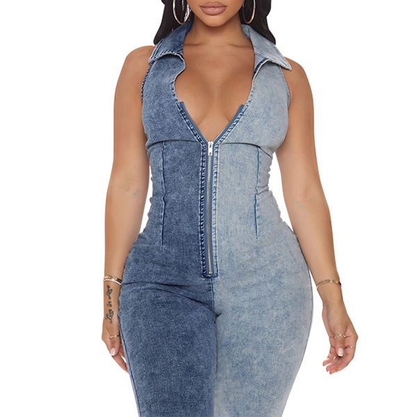 This is a trendy and edgy one-piece denim jumpsuit. It features contrast color detailing, a half-zipper front, stand collar, sleeveless design, and wide-leg silhouette for a stylish streetwear look. Wanna have a try?