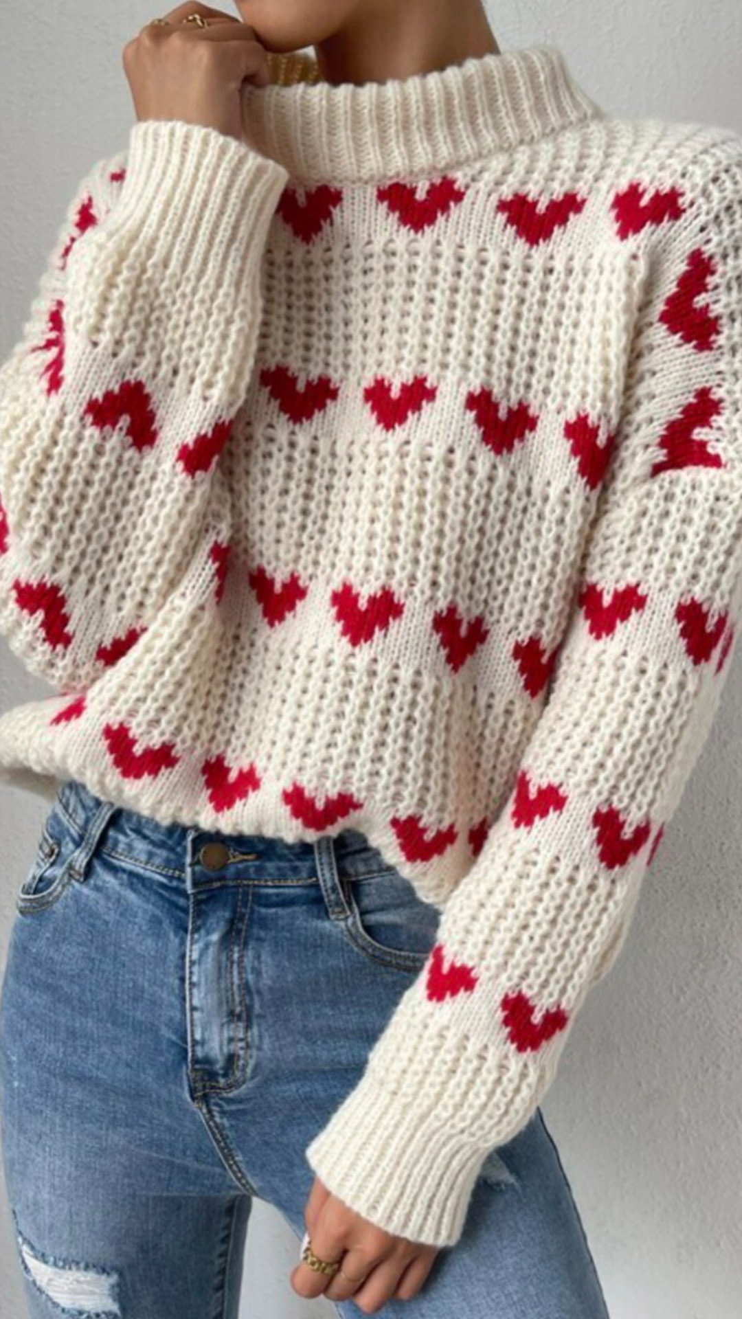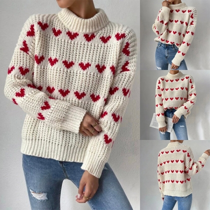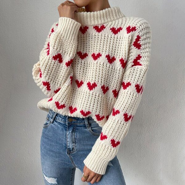 Street Fashion Contrast Color Heart Pattern Mock Neck Long Sleeve Knitted Sweater