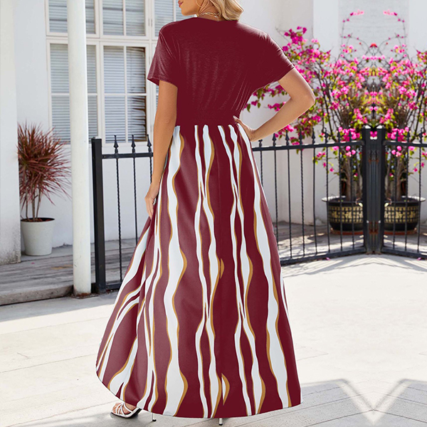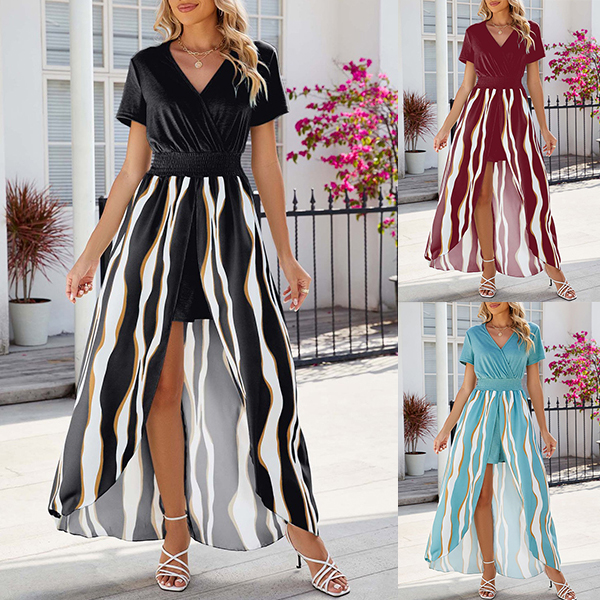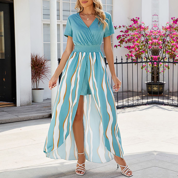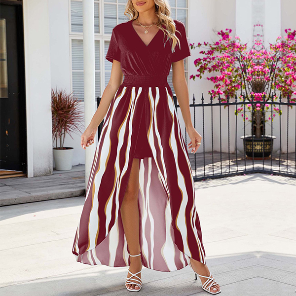 Street Fashion Contrast Color Printed V-neck Short Sleeve Slit High-low Hemline Dress