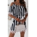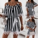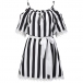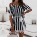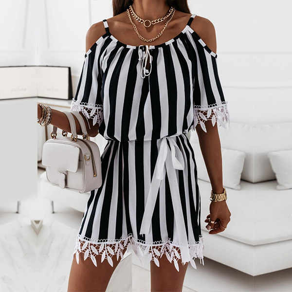 Street-fashion Contrast Color Stripe Printed Lace Spliced Open-shoulder Short Sleeve Self-tie Mini-Dress