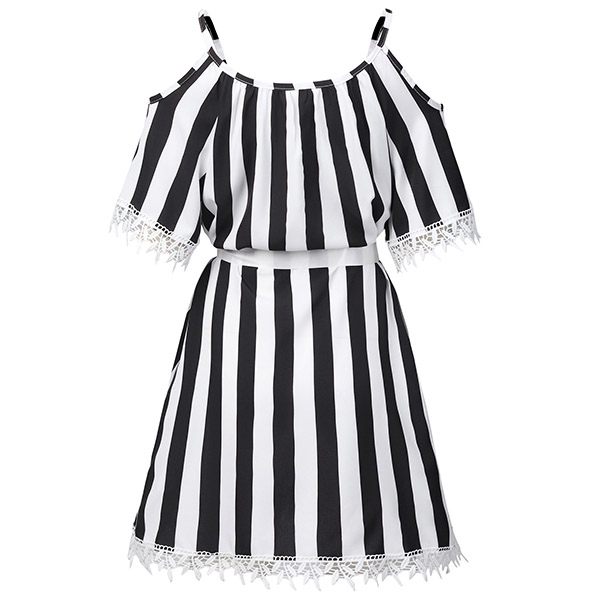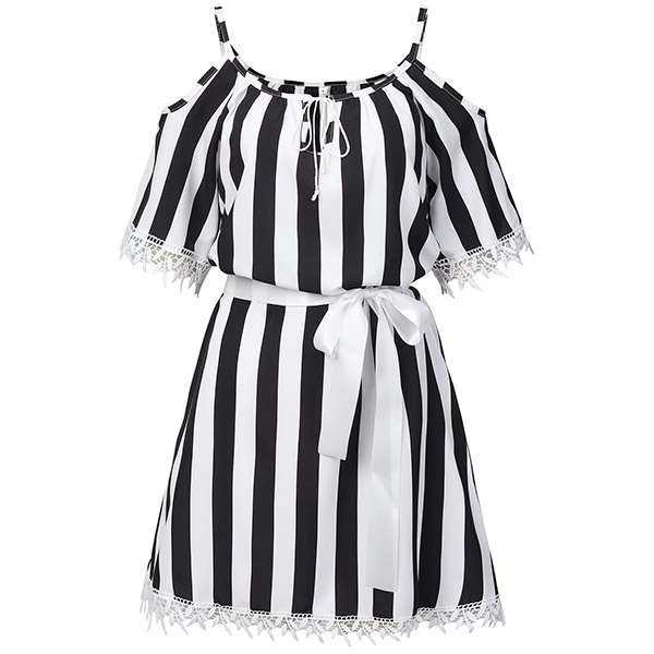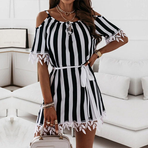 This dynamic, multi-faceted dress is a true showstopper. It features open-shoulder, lace spliced along the hemline and vertical stripe printed. Pair it with platform sandals and statement jewelry for a laid-back look.