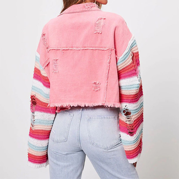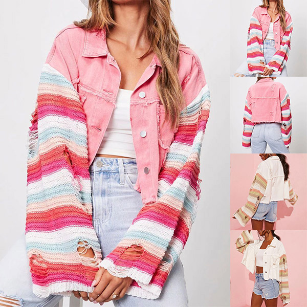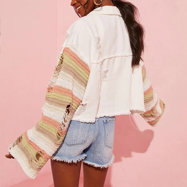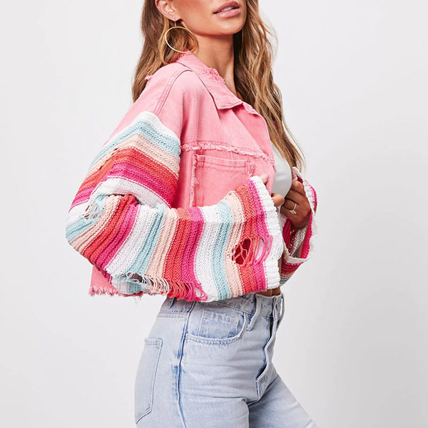Street Fashion Contrast Color Striped Knitted Spliced Frayed Jacket