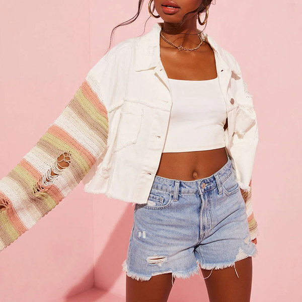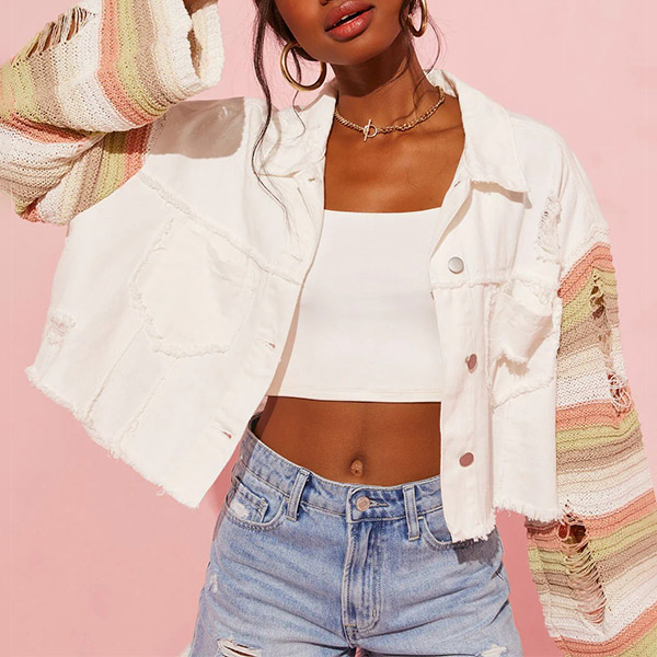 This jacket is the epitome of cool and edgy street style. The contrast color striped design adds a bold and eye-catching element, making a statement wherever you go. The knitted spliced detailing adds texture and dimension to the jacket, giving it a unique and trendy look. Wanna have a try?
