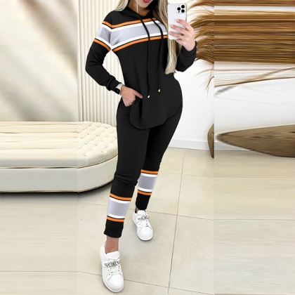 Street Fashion Contrast Color Two-piece Set Consist of Drawstring Hooded Sweatshirt and Sweatpants