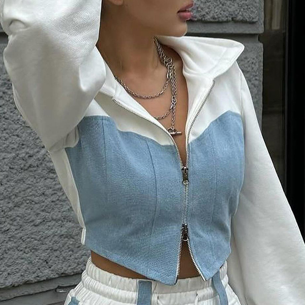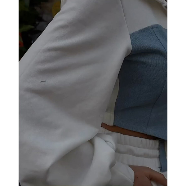 Own the streets in this edgy two-piece set that merges athletic comfort with urban fashion-forward style. The cropped hooded sweatjacket features unexpected denim splicing that adds texture, contrast, and contemporary street appeal. Paired with matching drawstring sweatpants, this coordinated set delivers effortless cool while keeping you comfortable all day long. Wanna have one?