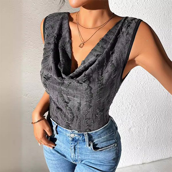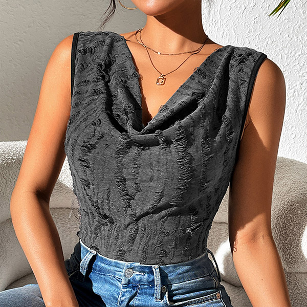 Featuring a distressed design and a dramatic draped neckline, this sleeveless shirt exudes an effortlessly cool and confident vibe. Pair it with high-waisted jeans and your favorite leather jacket for a cool, downtown-inspired ensemble.