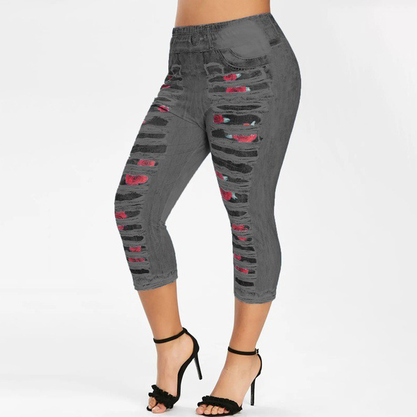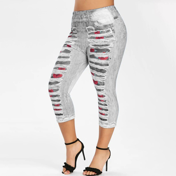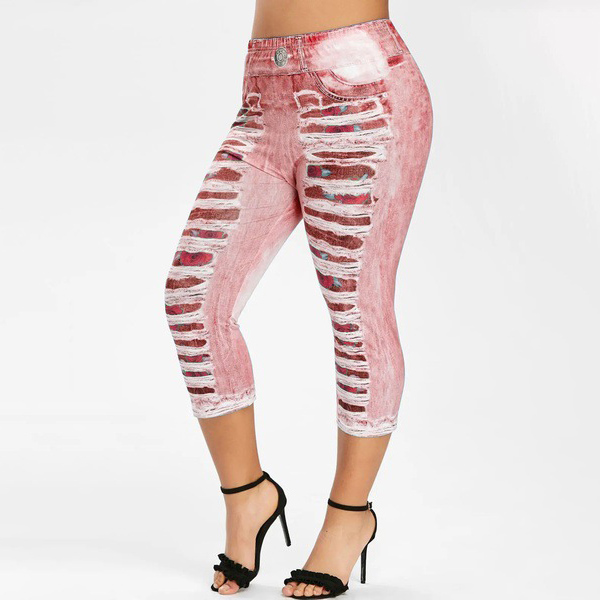 Street Fashion Distressed Printed Stretchable Leggings for Sports