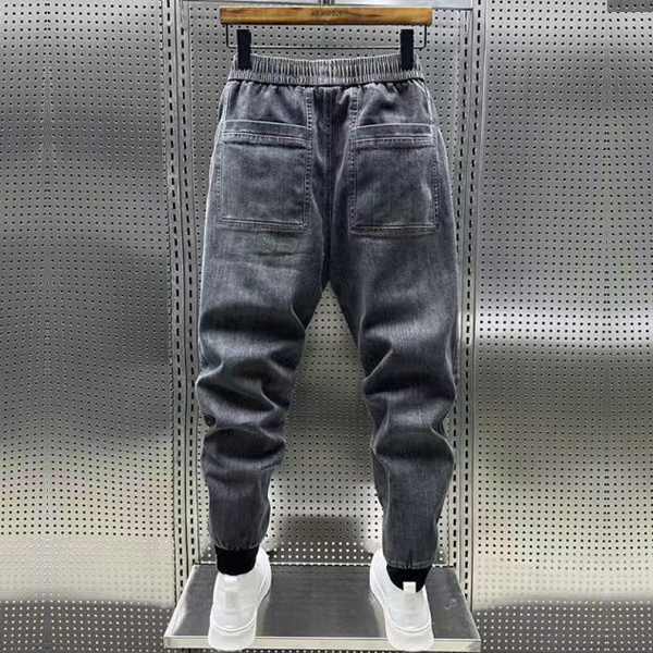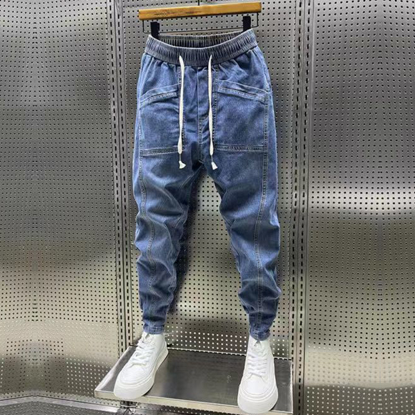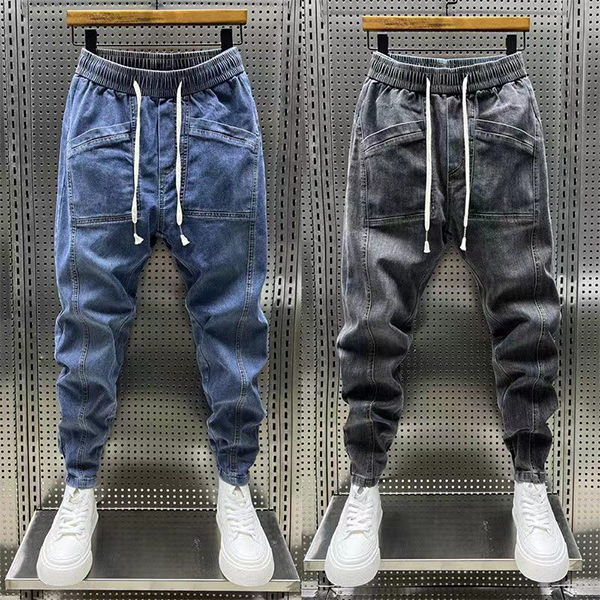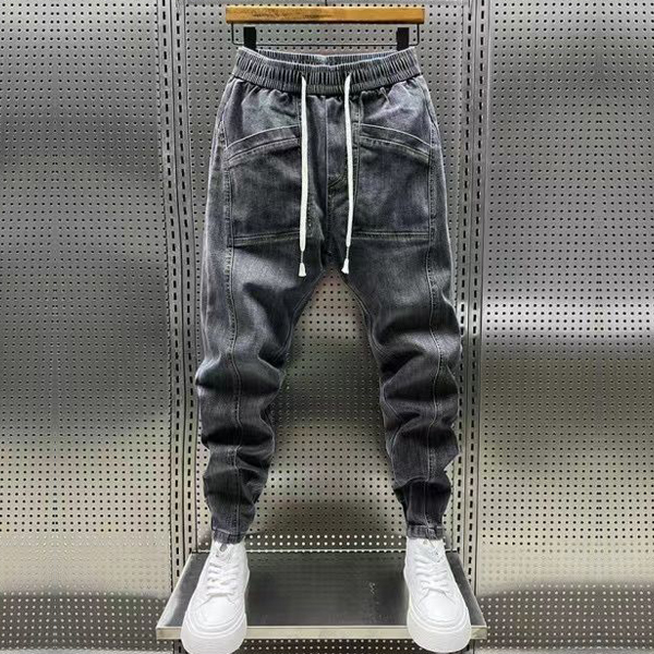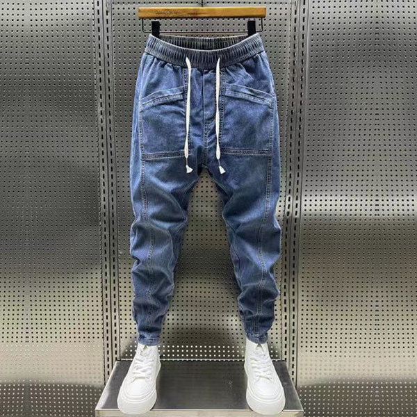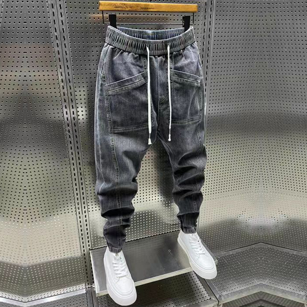 Street Fashion Drawstring Elastic Waist Patch Pockets Old-washed Denim Pants for Men