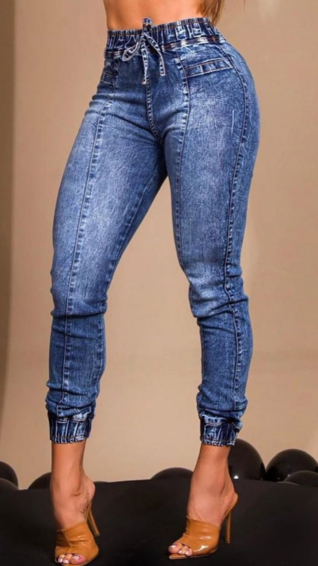 Street Fashion Elastic Waist Old-washed Denim Skinny Jeans