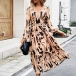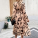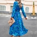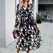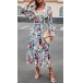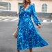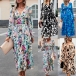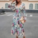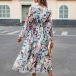 Street Fashion Floral Printed Lace Spliced V-neck Cinch Waist Long Sleeve Midi Dress