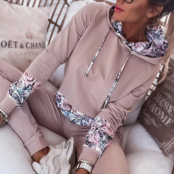 Street Fashion Floral Printed Spliced Two-piece Set Consist of Hooded Sweatshirt and Sweatpants