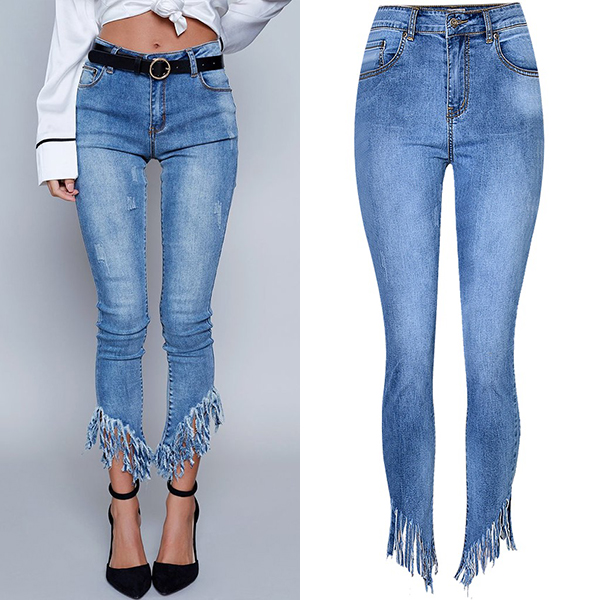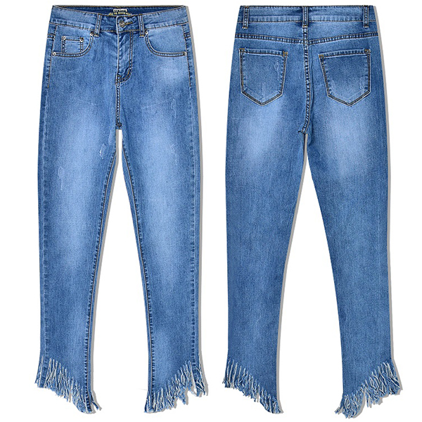 Street Fashion Frayed Tassel Irregular Hemline Old-washed Denim Jeans