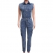Street Fashion Front Button Stand Collar Sleeveless Side Patch Pockets Self-tie Waist Old-washed Denim Jumpsuit
