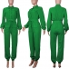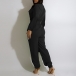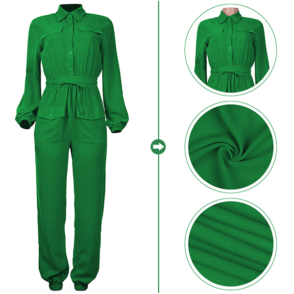 This chic and trendy jumpsuit features a flattering V-neckline and long sleeves for a stylish look. The front button detailing adds a touch of sophistication, while the elastic waist cinches in to accentuate your figure. The patch pockets add a functional and stylish element to the design. Perfect for a day out or a casual evening, this jumpsuit offers comfort and style in one versatile piece.