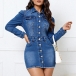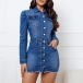 Street Fashion Front Buttoned Stand Collar Long Sleeve Frayed Hemline Old-washed Denim Dress