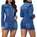 This denim dress combines a front buttoned design, a stand collar, long sleeves, and a frayed hemline for a fashionable and urban streetwear look.