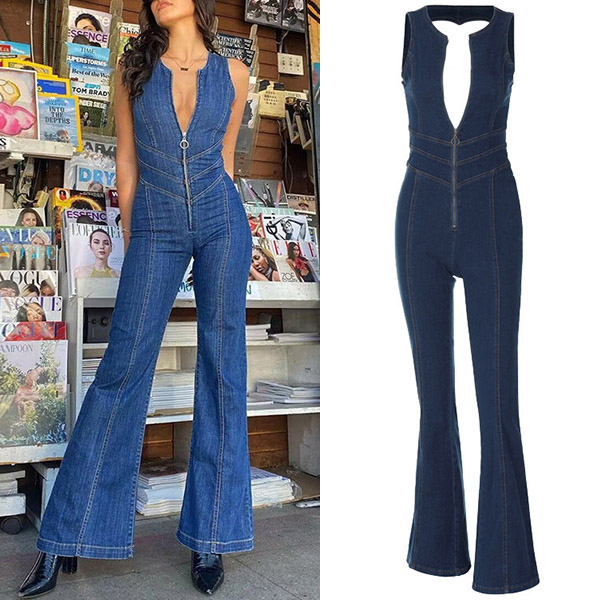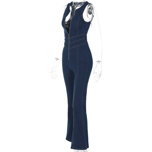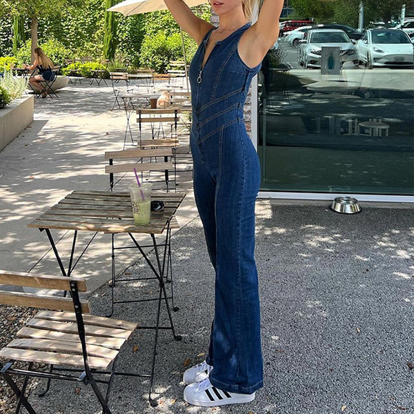 This denim jumpsuit combines a front zipper closure, sleeveless design, back heart shape cutout, and wide-leg silhouette for a cool and fashionable street style look.Crafted with high-quality denim fabric, this jumpsuit offers both durability and style.