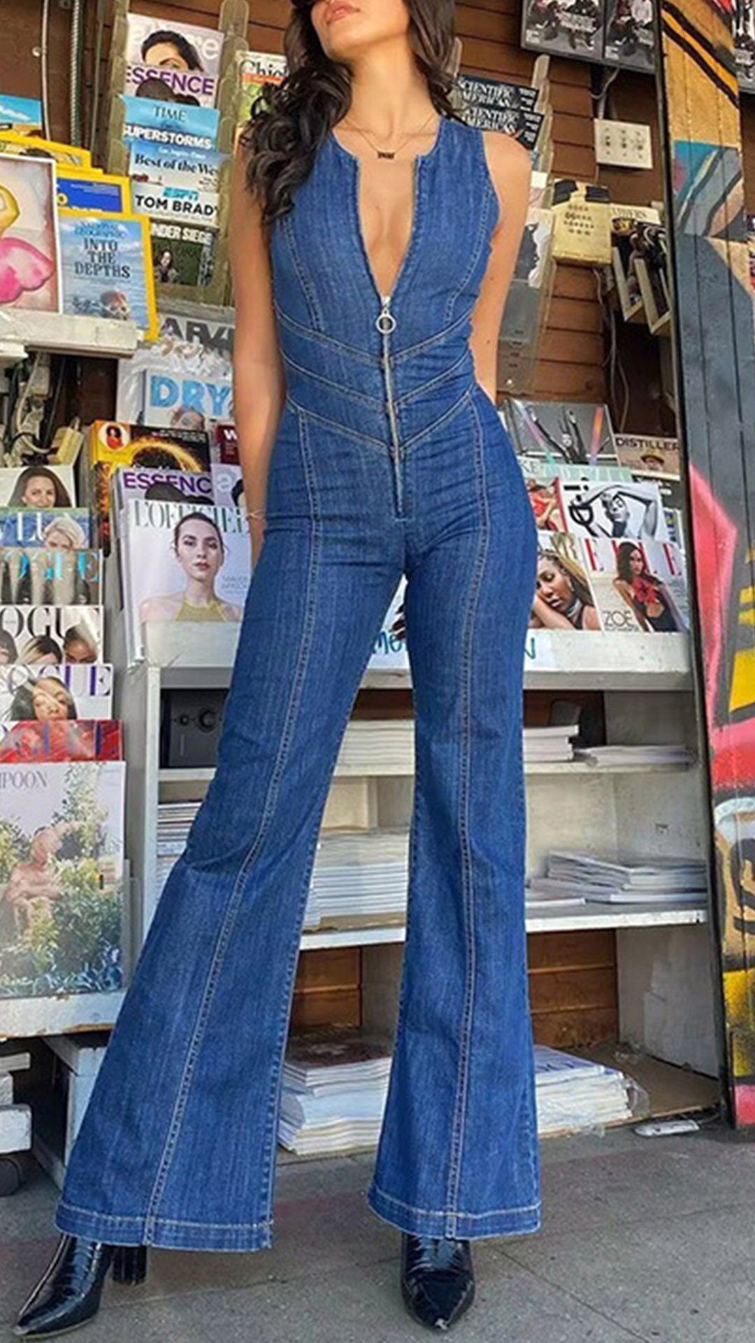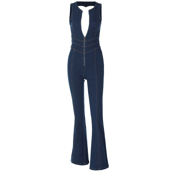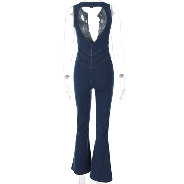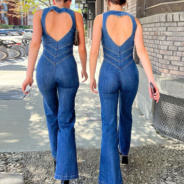 Street Fashion Front Zipper Sleeveless Back Heart Shape Cutout Wide-leg Denim Jumpsuit