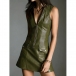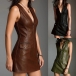 Street Fashion Front Zipper V-neck Sleeveless Patch Pockets Artificial Leather PU Dress