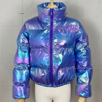 Veste courte matelassée à manches longues et col montant, style urbain, dégradé de couleurs.