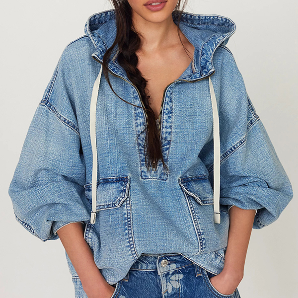 This oversized streetwear statement combines dramatic silhouette with functional design for bold urban appeal. The batwing sleeves create flowing, relaxed proportions that emphasize comfort and contemporary edge, while the half-zipper offers adjustable styling and sporty functionality. The drawstring hood adds practical versatility, and patch pockets provide authentic denim detailing with utilitarian appeal in a loose-fitting silhouette that celebrates oversized street fashion.Perfect for relaxed street styling, layering over fitted pieces, creative environments.
