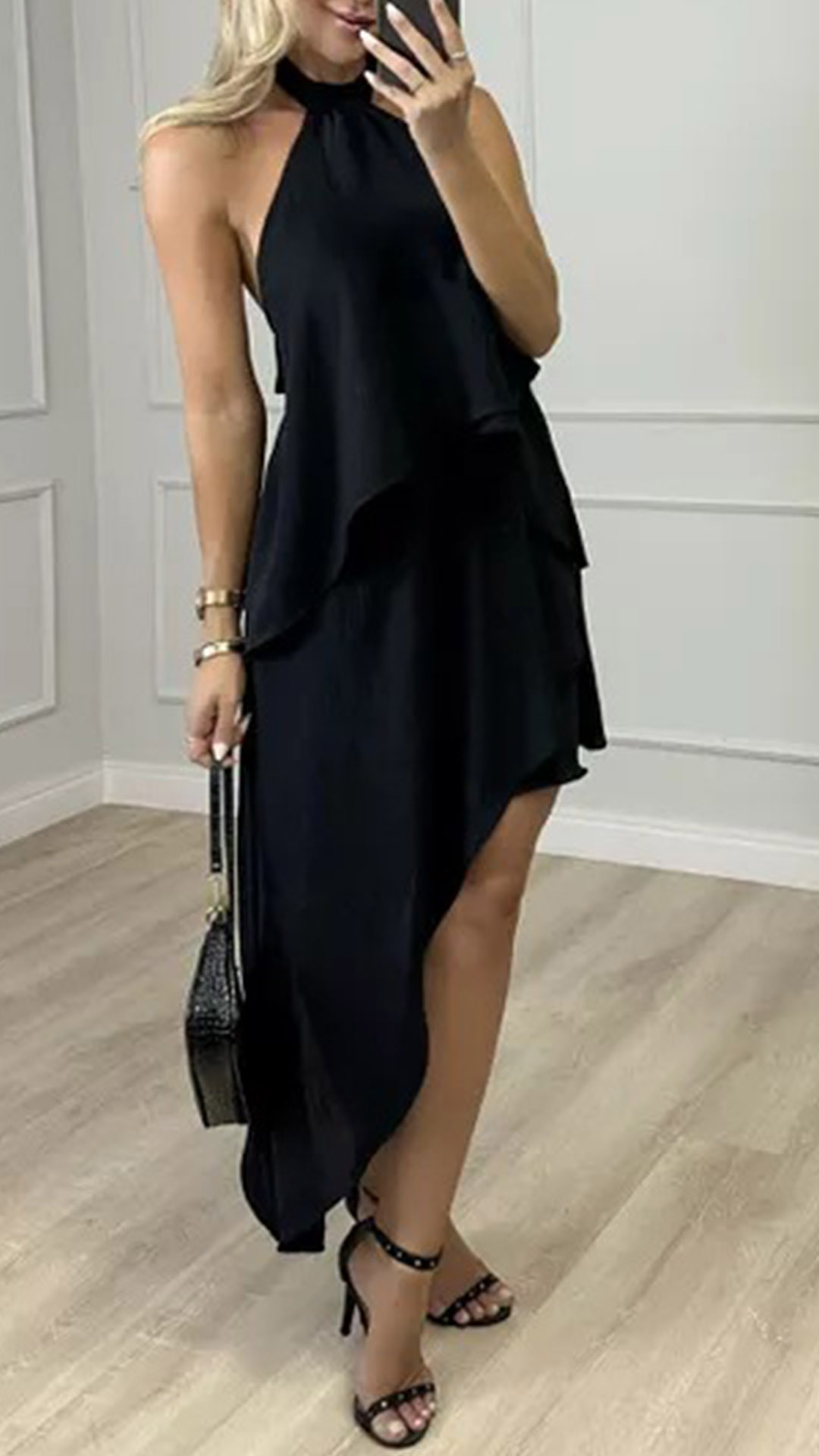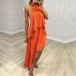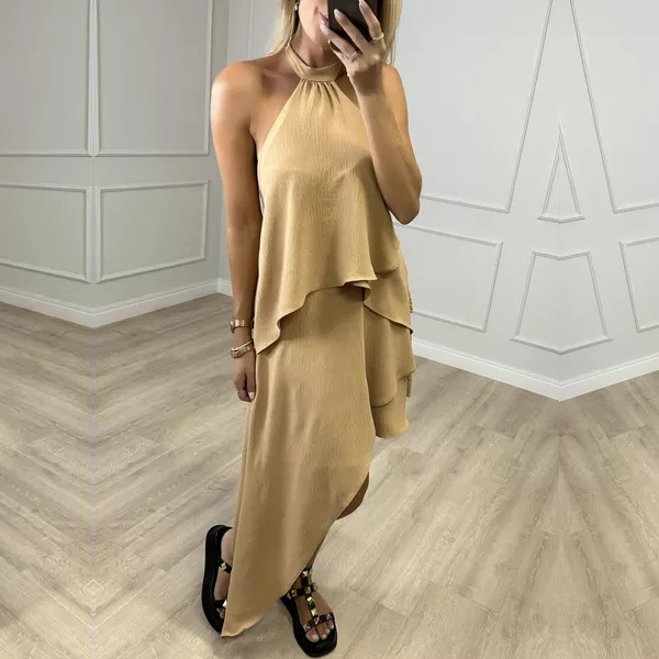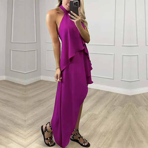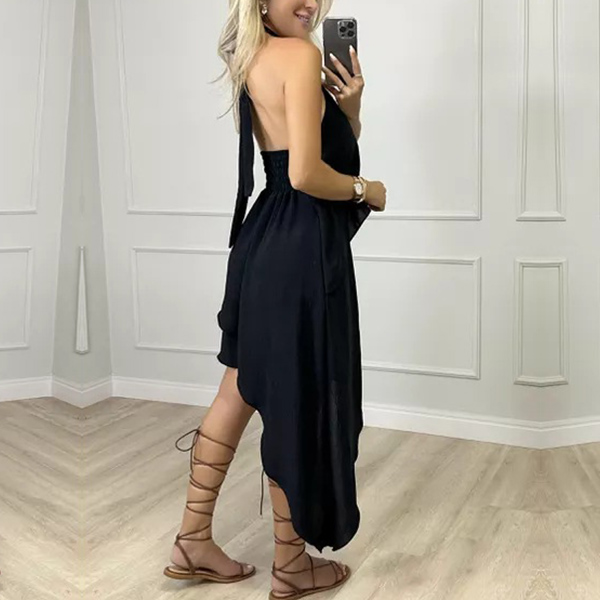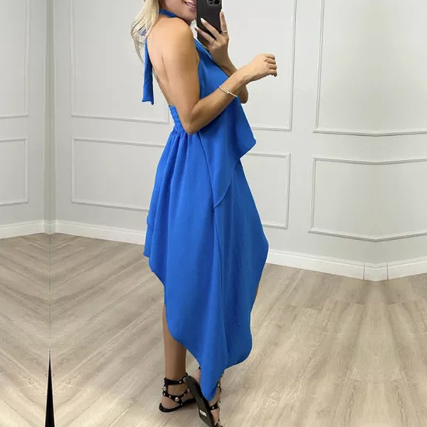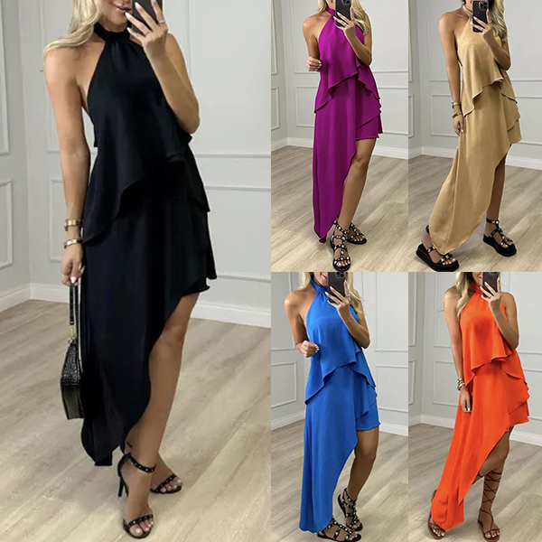 This fashion dress features halter neckline, backless design, sleeveless silhouette, and multi-layered irregular hemline for a trendy and edgy look. The multi-layered irregular hemline adds a sense of movement and drama to the dress. It creates a dynamic and fashionable look, making it stand out in any crowd. Wanna have one?