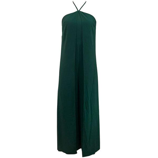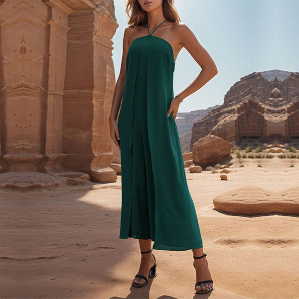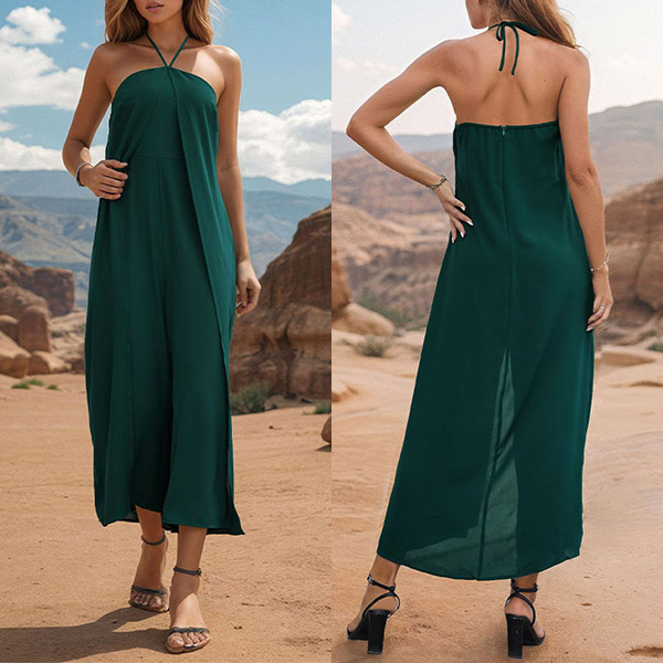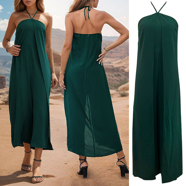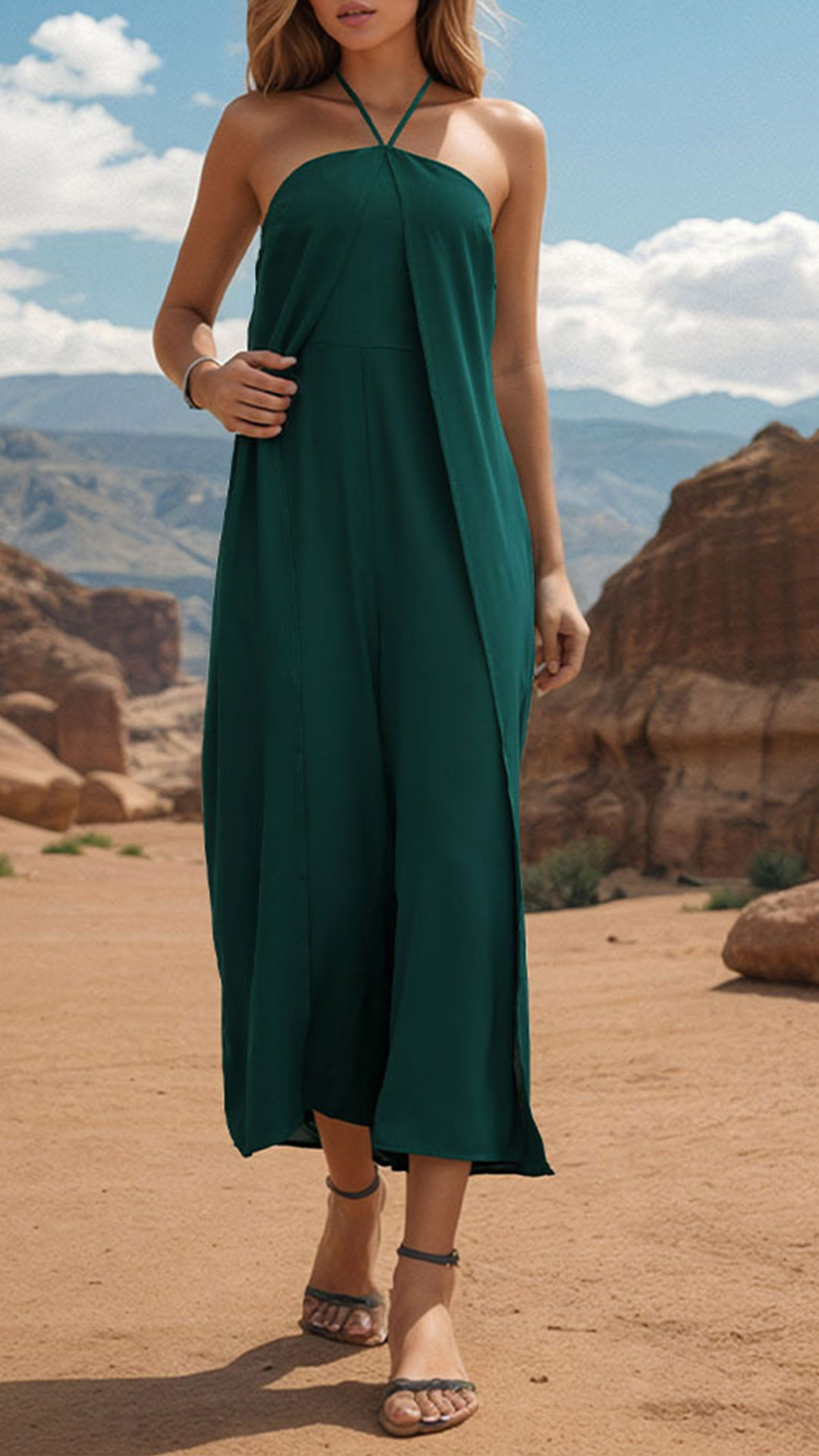 This jumpsuit features a unique combination of design elements, including a halter neck, strapless bodice, backless detail, and the high front slit adds a hint of playfulness and movement to the jumpsuit.