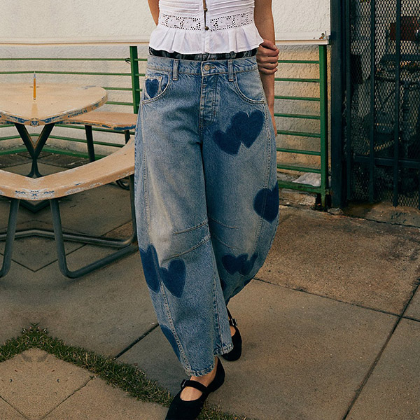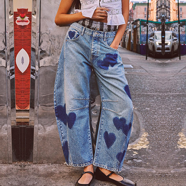 These eye-catching jeans are a perfect blend of casual street style and playful fashion. The standout feature is the heart-printed design, which adds a touch of whimsical charm to the classic denim silhouette. For a casual daytime look, pair the jeans with a simple t-shirt, a denim jacket, and a pair of sneakers or slip-on shoes.