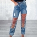 Street Fashion Heavy Distreeted Chain Old-washed Straight Cut Denim Jeans