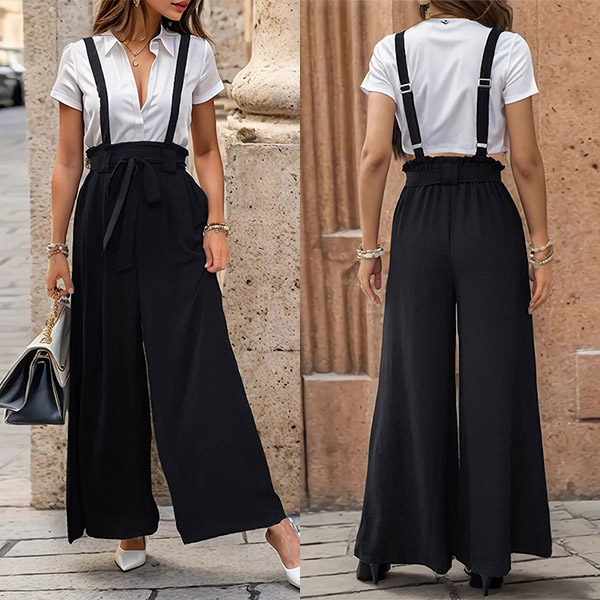 Features a high-rise waist, self-tie bowknot details, wide-leg silhouette, and suspenders for a street-inspired and chic look, these suspender pants are perfect for those who want to embrace a fashion-forward and confident street style. Pair them with a crop top or a graphic tee for a trendy and casual ensemble.