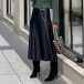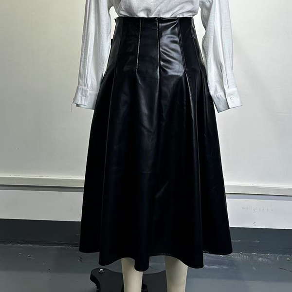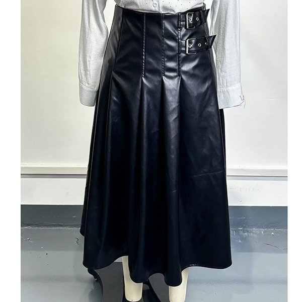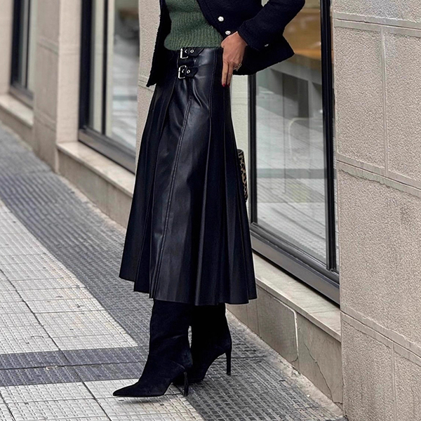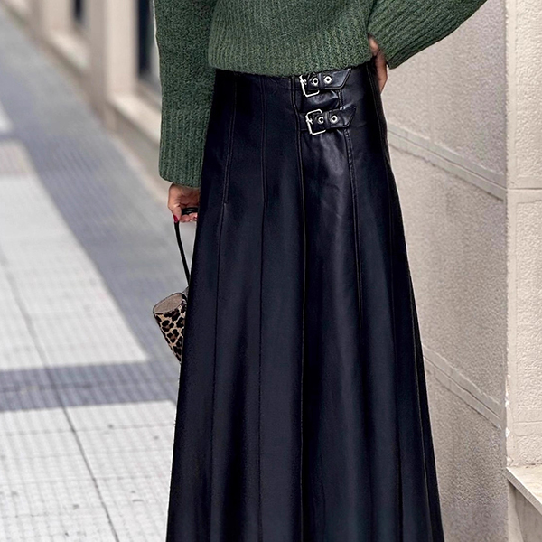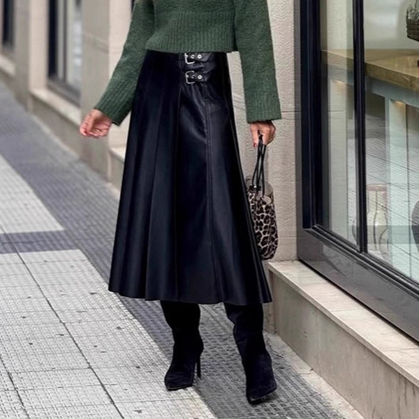 This midi skirt features bold artificial leather construction with side buckle detailing for urban sophistication. The high-rise waist creates flattering proportions whilst the PU material brings modern edge and street style appeal. Pair with fitted tops and ankle boots for balanced street sophistication. Perfect for evening occasions, street style events, or edgy casual wear.