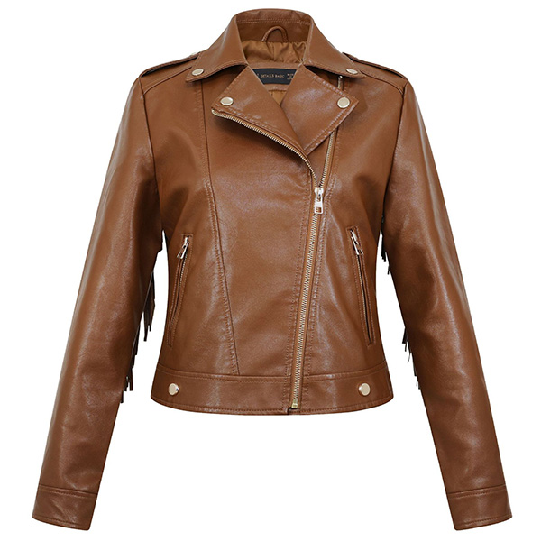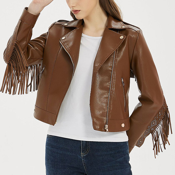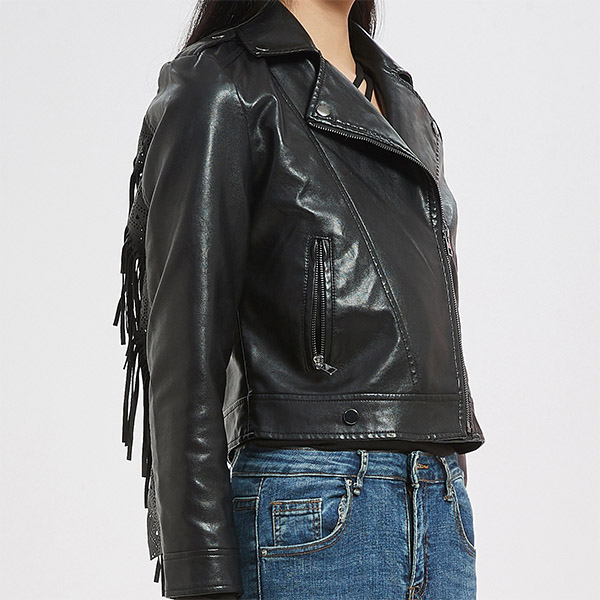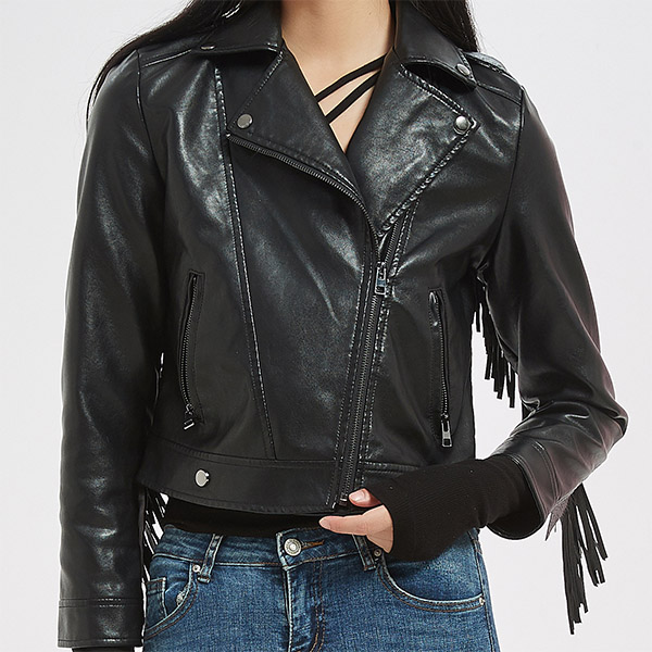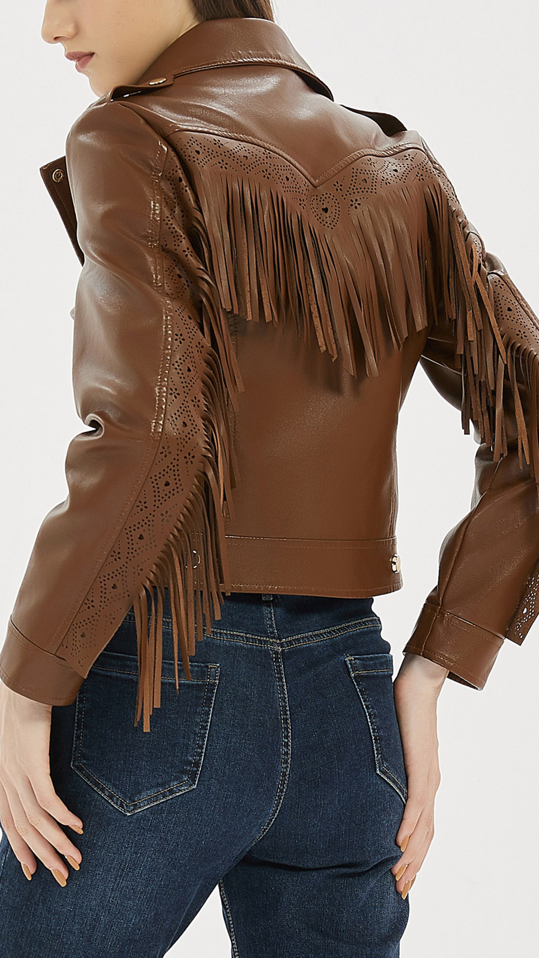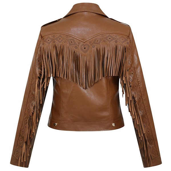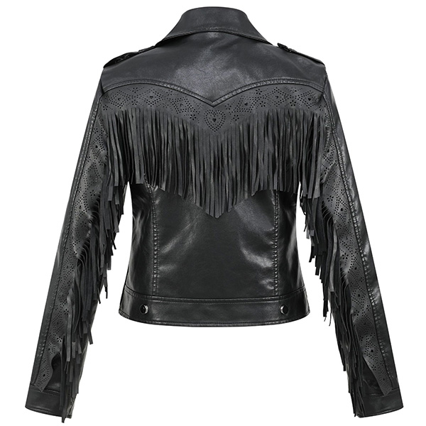 Street Fashion Hollow-out Tassel Stand Collar Lapel Long Sleeve Slant Zipper Artificial Leather PU Crop Jacket